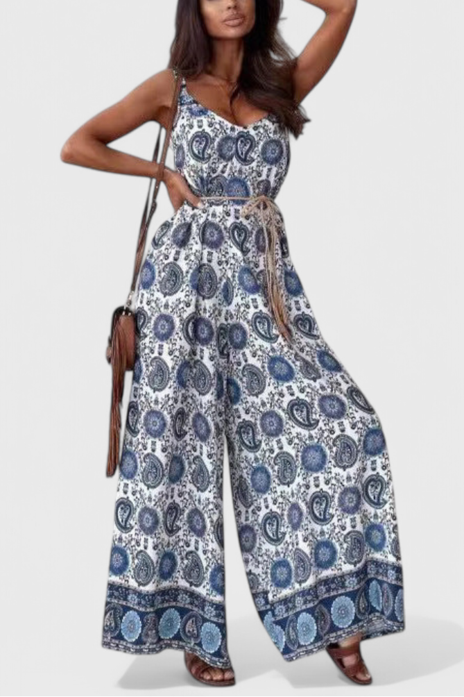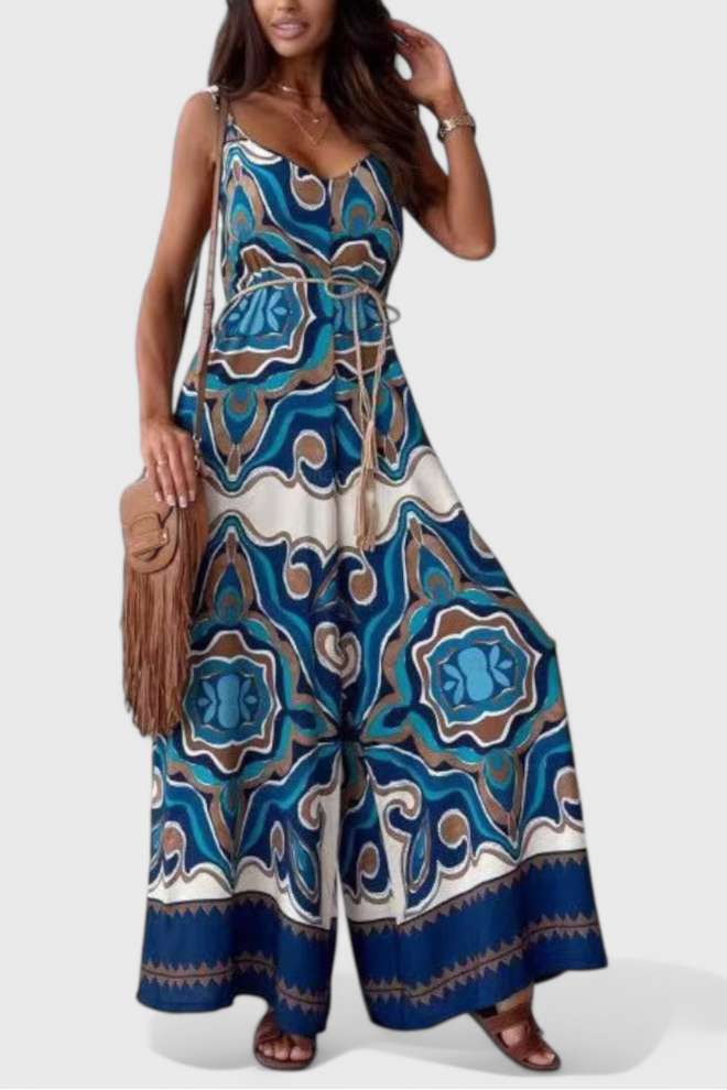 Udělejte nezapomenutelný dojem s modelem Gabriella: vzdušným overalem s širokými nohavicemi navrženým tak, aby upoutal pozornost. Díky lichotivému výstřihu do V, jemným špagetovým ramínkům a pásku zvýrazňujícímu pas tento kousek kombinuje výrazný vzor s nenucenou sofistikovaností. Ideální na slunečné výlety i elegantní večerní plány.